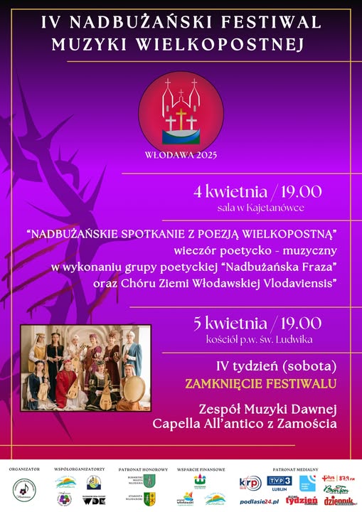 Już w najbliższy piątek, 4 kwietnia o godz. 19.00, w sali w Kajetanówce odbędzie się wydarzenie poetycko-muzyczne pt. „Nadbużańskie spotkanie z poezją wielkopostną" w wykonaniu poetów z Grupy Poetyckiej „Nadbużańska Fraza” oraz Chóru Ziemi Włodawskiej „Vlodawiensis”. Spotkanie będzie miało charakter rozważań drogi krzyżowej.Uroczyste zamknięcie Festiwalu odbędzie się w sobotę, 5 kwietnia o godz. 19.00. Podczas wydarzenia wystąpi zespół Muzyki Dawnej z Zamościa Capella all’Antico. Jak informują organizatorzy zespół działa od 1983 r. przy Zamojskim Domu Kultury i jest jednym z czołowych polskich zespołów amatorskich, prezentujących muzykę kompozytorów europejskich epoki średniowiecza i renesansu. Skupia w sobie utalentowaną muzycznie młodzież z zamojskich szkół podstawowych, średnich oraz studentów.