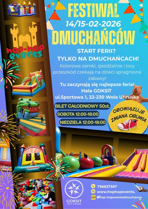 Ponadto na hali Gminnego Ośrodka Kultury Sportu i Turystyki w Woli Uhruskiej odbędzie się Festiwal Dmuchańców, który rozpocznie długo wyczekiwane ferie zimowe.
