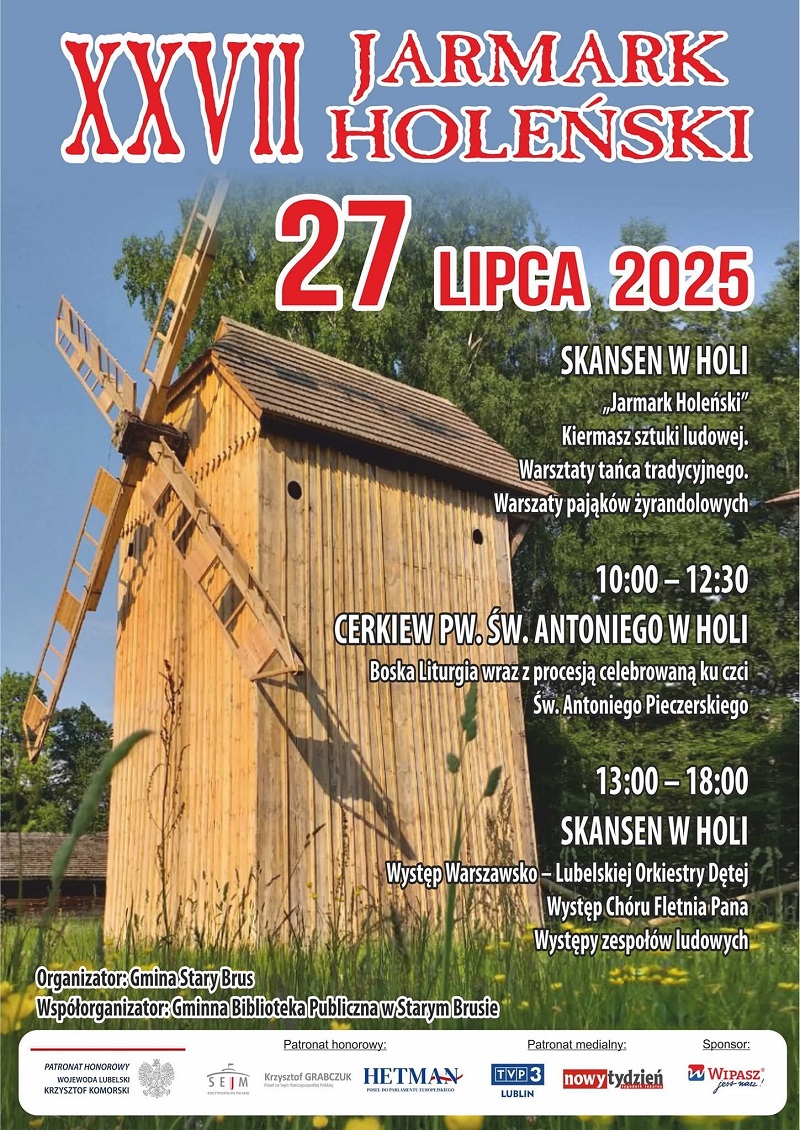 Dziesiątki wystawców, setki turystów oraz pielgrzymów z Lubelszczyzny i całego kraju, kolorowe alejki z rękodziełem i regionalną żywnością, występy artystów z Polski, Ukrainy, a także Białorusi, to wszystko będzie miało miejsce podczas XXVII Jarmarku Holeńskiego organizowanego w skansenie w Holi. Ostatnia niedziela lipca będzie, jak co roku, pełna folkloru, rzemiosła oraz religijnych obrzędów.