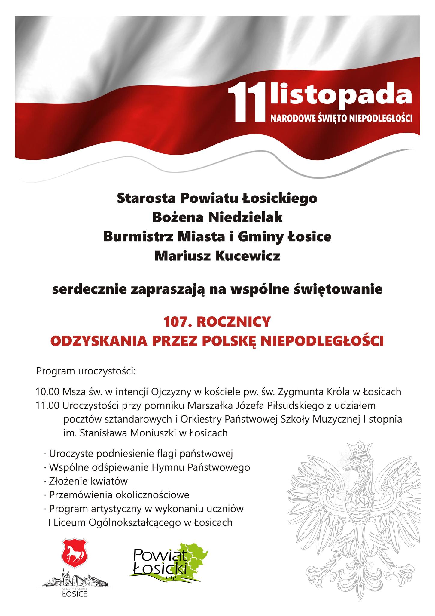11 listopada w wielu miastach naszego regionu odbędą się obchody 107. rocznicy odzyskania przez Polskę niepodległości. Uroczystości zaplanowano również w Łosicach.