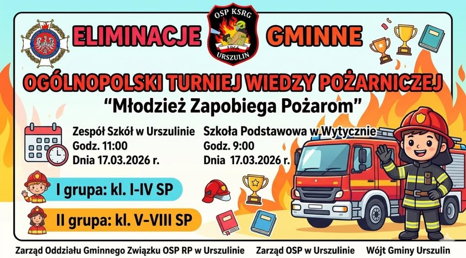 W Urszulinie odbędą się eliminacje gminne Ogólnopolskiego Turnieju Wiedzy Pożarniczej pod hasłem „Młodzież Zapobiega Pożarom”. Wydarzenie będzie dobrą okazją dla najmłodszych mieszkańców gminy do sprawdzenia swojej wiedzy z zakresu bezpieczeństwa, ochrony przeciwpożarowej oraz pracy strażaków.