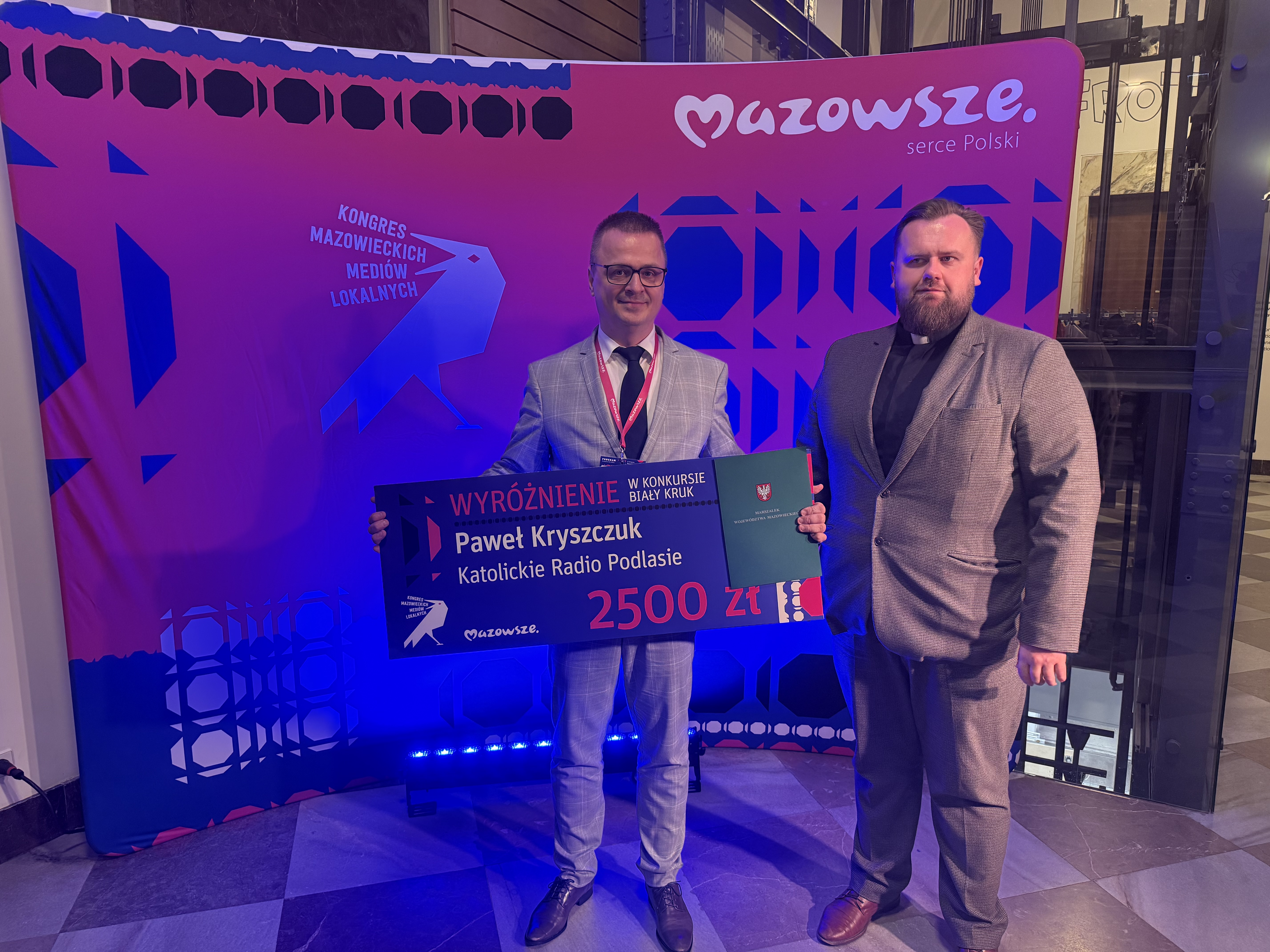 Najlepsi dziennikarze lokalnych i regionalnych mediów z Mazowsza zostali uhonorowani podczas gali wręczenia Nagród Marszałka Województwa Mazowieckiego „Biały Kruk”. Uroczystość była zwieńczeniem II Kongresu Mazowieckich Mediów Lokalnych, a wyróżnienia przyznano w dziesięciu kategoriach. W tegorocznej edycji konkursu o statuetkę „Białego Kruka” rywalizowało aż 137 prac dziennikarskich. Jury, w którego skład weszli wybitni przedstawiciele świata mediów i nauki, wyłoniło 13 laureatów oraz przyznało 28 wyróżnień. Autorzy najlepszych materiałów otrzymali pamiątkowe statuetki i nagrody finansowe. W kategorii „Materiał radiowy – reportaż” nagrodę otrzymał Paweł Kryszczuk z Katolickiego Radia Podlasie.