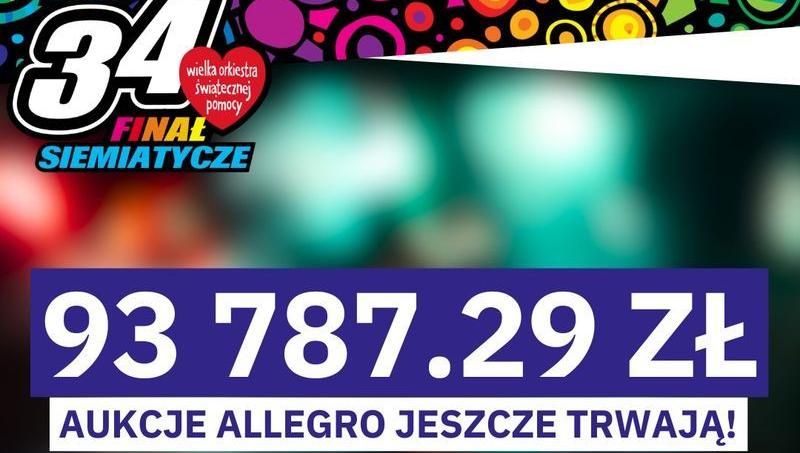 93 787,29 zł taką sumę pieniędzy zebrano podczas tegorocznego finału WOŚP w Siemiatyczach. Kwota opublikowana w poniedziałkowy wieczór, nie jest kwotą ostateczną. Jak przypominają organizatorzy, nadal trwają aukcje. Dopiero po ich zakończeniu możliwe będzie końcowe podsumowanie zbiórki.